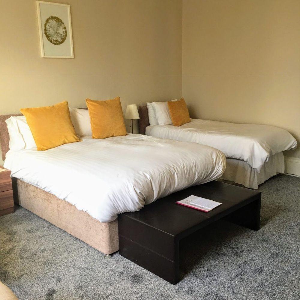 A large room with a Kingsize & single bed, ensuite bathroom featuring a separate bath and shower, tea & coffee making facilities , WiFi & TV.