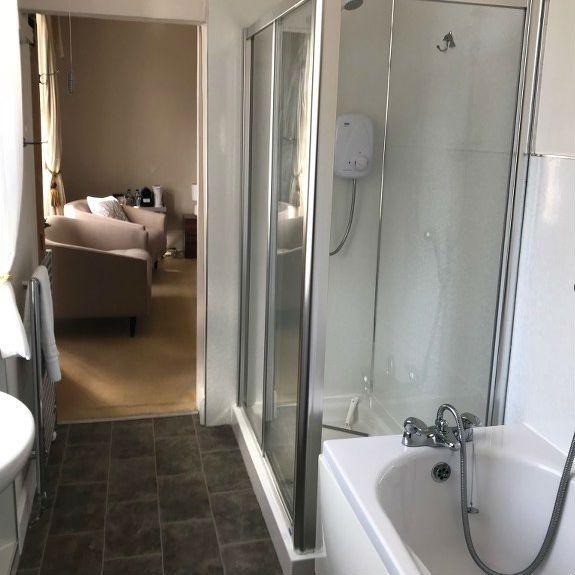 A spacious room featuring a double bed, ensuite bathroom with a bath and shower over the bath, tea & coffee making facilities, WiFi & TV