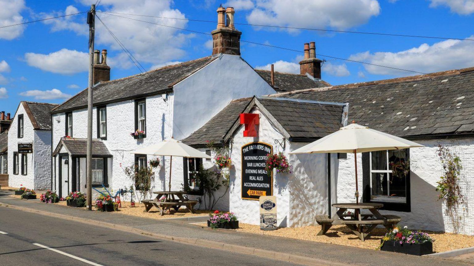 A traditional Inn ideally situated in the peaceful village of Clarencefield near Dumfries in South West Scotland. If you are looking for accommodation, good traditional food, real ales and a relaxed atmosphere come visit the Farmers Inn, Clarencefield. The Farmers Inn is located only 20 minutes away from the M74/M6 and easily accessible from the A75, making us ideally situated for wedding guests, golfers, birdwatchers, fishermen, cyclists and visitors to the area looking to relax in a friendly atmosphere. Our Motel style bedrooms are in a self-contained annexe built in 1996. Each room has its own “front door” which enables guests to come and go as they please. The rooms have recently been refurbished and are all en-suite. Free WiFi is available in our rooms as well as in the public areas.